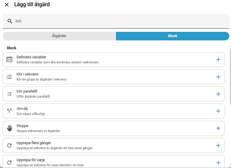 Det finns många saker att välja och använda i lägg till åtgärd. Personligen använder jag bara en bråkdel av alla funktioner som finns att välja mellan. Strukturen av alla val är bra och något som jag använder flitigt är sökfunktionen. Längst upp finns en röd som heter Sök åtgärd. Skriver jag t ex Lampa får jag upp alla åtgärder som är kopplade med funktionen lampa.