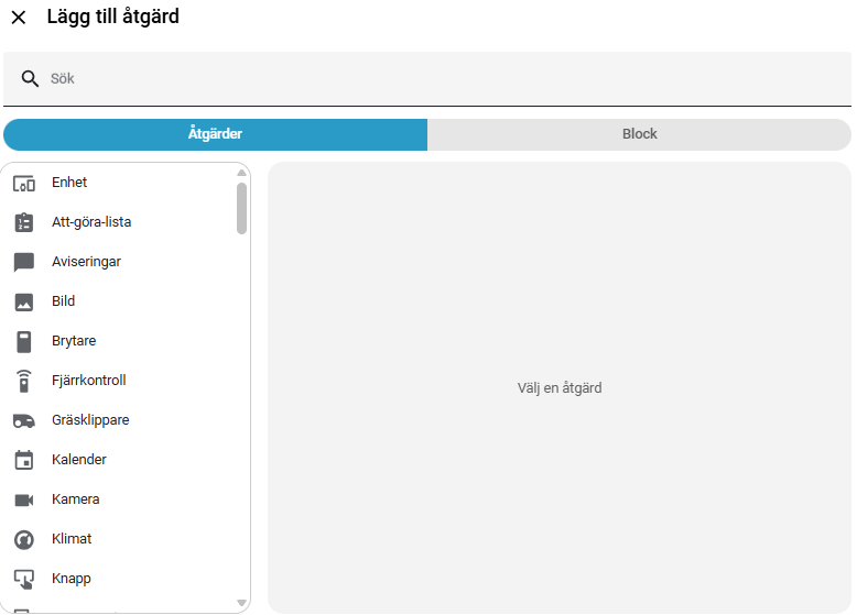 Enhet, Att Göra-lista, Avisering, Bild, Brytare, Fjärrkontroll, Fläkt, Gräsklippare, Kalender, Kamera, Klimat, Knapp, Lampa, Larmkontrollpanel, Lås, Mediaspelare, Nummer, Scen, Siren, Skydd, Välj, Hjälpare och Byggblock