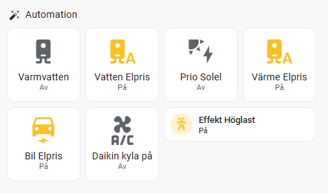 Alla funktioner är uppbyggda med integrationer och Automationer i Home Assistant. Jag har samlat alla mina funktioner, hur jag byggt upp dom på sidan: Funktioner för smarta hem med Home Assistant (2026) Under sektionen Energioptimering har jag samlat alla mina energi funktioner med Home Assistant.