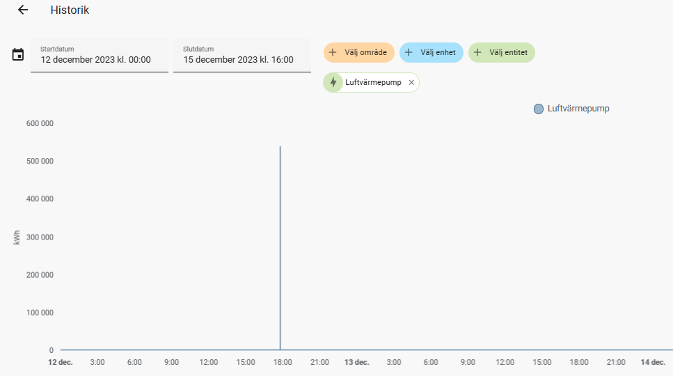 Har haft ett problem att jag har fått spikar från vissa z-wave enheter så att fel energivärde visas i Home Assistant energi Dashboard Sedan installationen av Connect ZWA-2 zwave kontroller så har jag inte sett detta problem något mer. Nedan är ett exempel som hände ganska ofta. Mellan 16:00-17:00 har min luftvärmepump konsumerat över 70 000 kWh. Kanske inte så ...