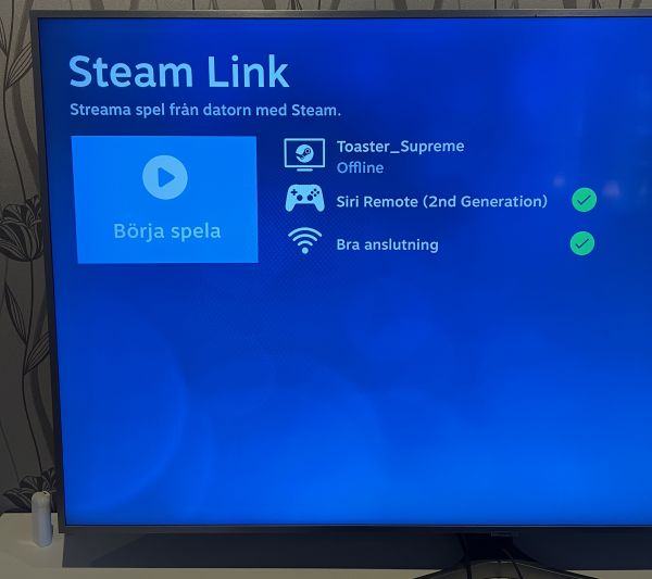 Vi använder Steam Link appen för att strömma spel från datorn till våra TV apparater som är kopplade med Apple TV eller Google TV Många spel som finns på Steam går att strömma till en Apple TV eller Google TV med hjälp av appen Steamlink. Det funkar genom att nätverket där datorn med Steam finns på, finns även en Apple ...